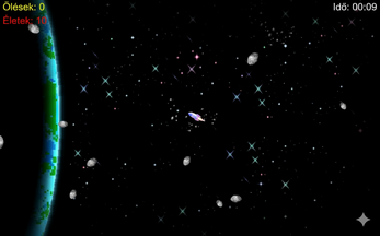 The little rocket has a timer, a kill counter on. You can flip around avoid meteors with arrows. "WASD" control for the Rocket.